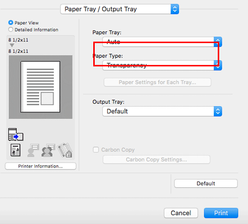 In [Paper Type:] in [Paper Tray / Output Tray], select [Transparency].