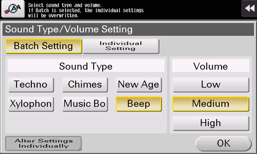 [Sound Type/Volume Setting] | Specify the sound type and volume for each of [Operation Confirmation Sound], [Successful Completion Sound], [Completed Preparation Sound], [Caution Sound], [Deletion Sound], and [Authentication Sound]. When [Batch Setting] is selected, all the sound type and volume will be set at once. When [Individual Setting] is selected, all the sound type and volume will be set separately. |