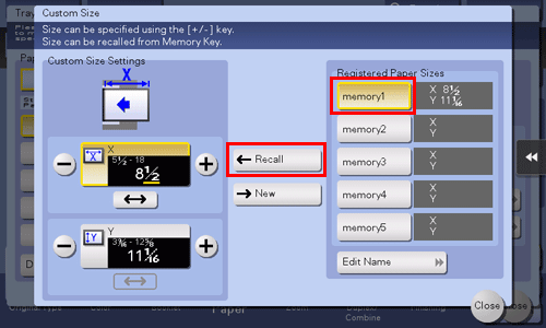 Select the paper size to recall from [Registered Paper Sizes], then tap [Recall].