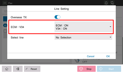 This machine uses the V.34 protocol communication by default. You can send faxes with V.34 canceled if it is not possible to establish a communication in the Super G3 mode depending on telephone line conditions (for example, when the remote or this machine is connected to a PBX line).