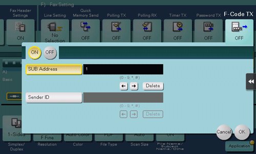 4. Tap [Application] - [Fax Setting] - [F-Code TX], and tap [ON].
