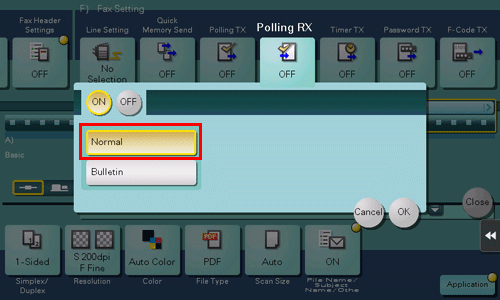 3. Tap [Application] - [Fax Setting] - [Polling RX], and tap [ON].
