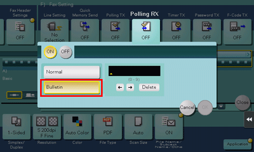 4. Tap [Bulletin], enter the number of the Bulletin Board User Box in the receiving machine, and tap [OK].