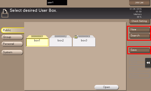 You can tap [New] to create a new User Box. For details, refer to Here.