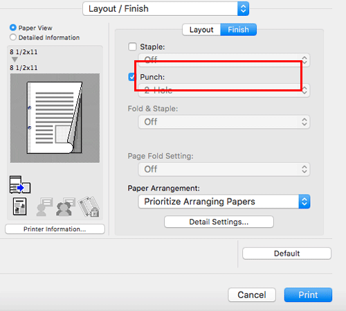 In [Layout / Finish], select the [Punch:] check box. In addition, specify the number and positions of punch holes.