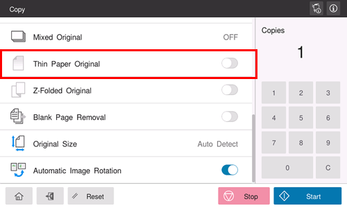 When scanning an original that is thinner than plain paper on the ADF, set this option to ON. This function reduces the original feed speed of the ADF to prevent thin paper from getting caught.