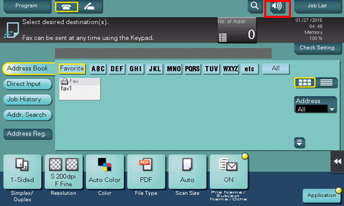 If you tap the voice icon on the screen in the scan/fax mode of classic style, this machine reads out the operation procedure when you directly enter a fax number. Also, when selecting a destination from the address book or history, this machine reads out the operation procedure. This is helpful to prevent a fax from being sent to an incorrect destination.