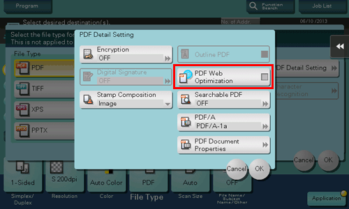 To create a PDF file optimized for Web view, select [PDF] or [Compact PDF] as the file type, then set [PDF Web Optimization] to ON in [PDF Detail Setting] (default: OFF).