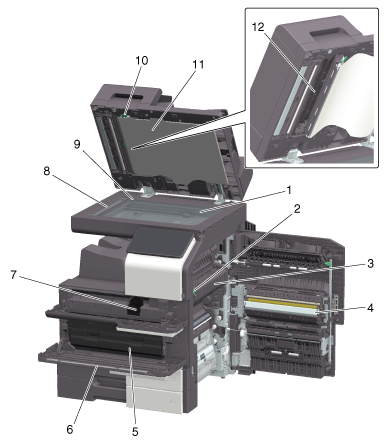 11 | Bypass Tray | Used to print data on irregularly size paper, thick paper, transparencies, postcards (4 6 (A6 Card)), envelopes, or label sheets. For details on the available paper, refer to Here. |