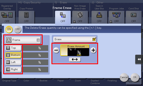 To specify the width of the frame to be erased individually, set [Frame] to OFF, select a target side, then specify the width to be erased.