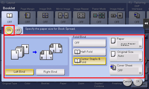 [Fold/Bind] | Select [Center Staple & Fold]. This function staples copies at two places along the center and folds the copies in half before feeding them out. |