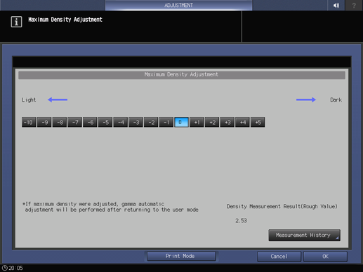 5. After outputting the charts, the screen returns to the Maximum Density Adjustment screen and the measurement result is displayed under Density Measurement Result (Rough Value) in the lower right of the screen.