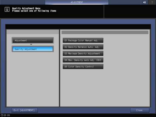 2. Press Quality Adjustment and Max. Density Auto Adj. (RU) in sequence.