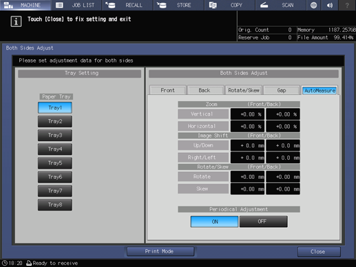 • On the MACHINE screen, press Adjustment - Quality Adj. - Periodical Both Sides Adj. in sequence, and set Period. Both Sides Auto Adj. to ON. You can then set Periodical Adjustment to ON or OFF. For the tray set to ON, Periodical Adjustment is available. For details, refer to Periodical Both Sides Adj..