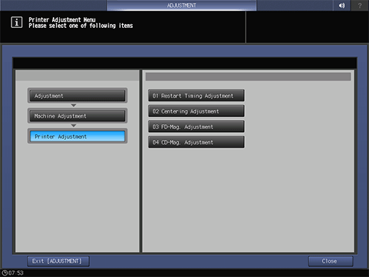 2. Press Machine Adjustment, Printer Adjustment, and Restart Timing Adjustment in sequence.