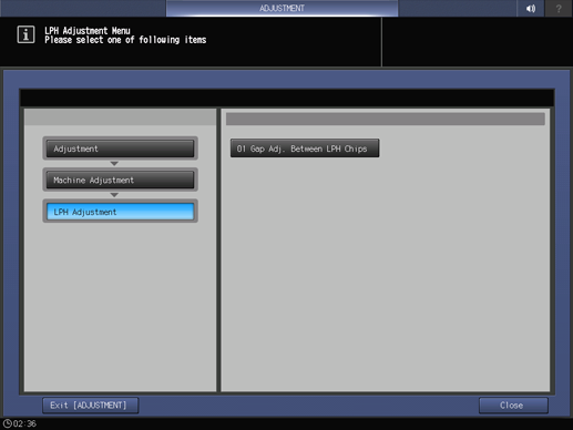 Press Adjustment on the MACHINE screen to display the Adjustment Menu screen.