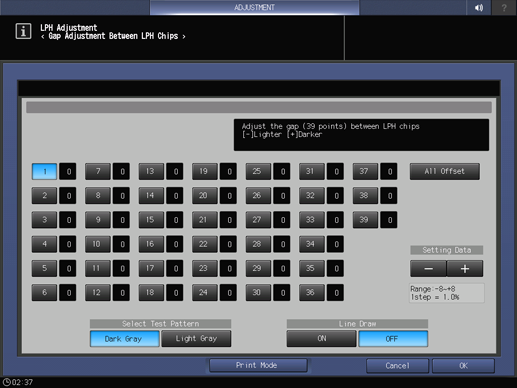 On the Gap Adjustment Between LPH Chips Screen, select one from 1 to 39 point keys that corresponds to the identified gap point, then press + or - to enter setting data. To make universal adjustment, select All Offset and enter setting data.