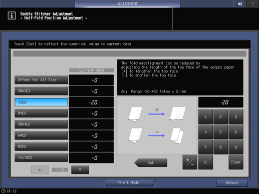 Press Half-Fold Position Adj. on the Saddle Stitcher Adjustment menu.