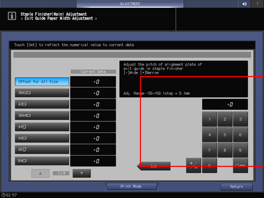 Objects of Adjustment: Offset for All Size, SRA3 short edge feed, A3 short edge feed, SRA4 short edge feed, A4 long edge feed, A4 short edge feed, A5 long edge feed, B4 short edge feed, B5 long edge feed, 8K short edge feed, 16K long edge feed, 12 18 short edge feed, 11 17 short edge feed, 9 11 long edge feed, 8.5 11 long edge feed, 8.5 11 short edge feed, 8.5 14 short edge feed, 8 13 short edge feed, 13 19 short edge feed, B5 short edge feed, Postcard, 5.5 8.5 long edge feed, 16K short edge feed, Custom(380~488 mm), Custom(220~379 mm), Custom(139~219 mm)