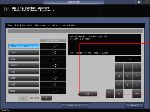 2. Press Finisher Adjustment, Staple Finisher Adjustment, Staple Finisher(Main) Adj., and Rewind Paddle Descent Adj. in sequence.