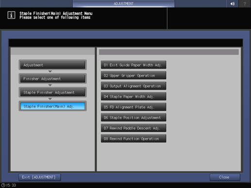 The screen returns to the Staple Finisher(Main) Adjustment Menu screen.