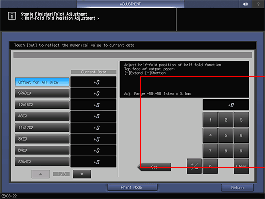 Press Exit PrintMode to return to the Half-Fold Fold Position Adj. screen.