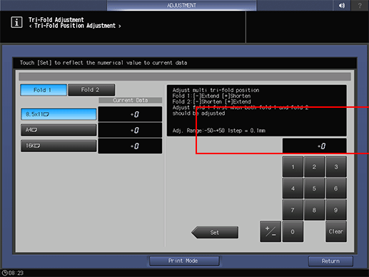 Adjust the positions of Fold 1 and Fold 2 for Tri-Fold in Saddle Stitcher SD-510 mounted in Finisher FS-532. Make this adjustment if the Multi Tri-Fold position is not within the allowance range.