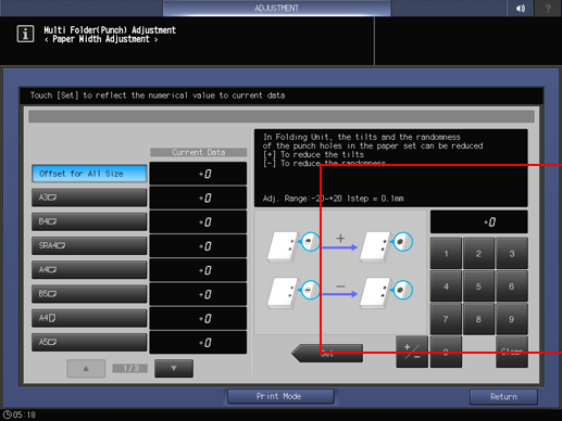 Objects of Adjustment: Offset for All Size, A3 short edge feed, B4 short edge feed, SRA4 short edge feed, A4 short edge feed, B5 short edge feed, A4 long edge feed, A5 short edge feed, B5 long edge feed, A5 long edge feed, 12 18 short edge feed, 11 17 short edge feed, 8.5 14 short edge feed, 8.5 11 short edge feed, 8.5 11 long edge feed, 8 13 short edge feed, 8K short edge feed, 16K long edge feed, 16K short edge feed, 9 11 long edge feed, 5.5 8.5 long edge feed
