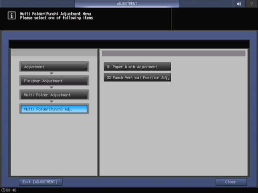 Press Finisher Adjustment, Multi Folder Adjustment, Multi Folder(Punch) Adj., and Paper Width Adjustment in sequence.