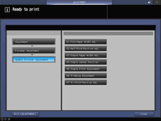 The screen returns to the Saddle Stitcher Adjustment Menu screen.