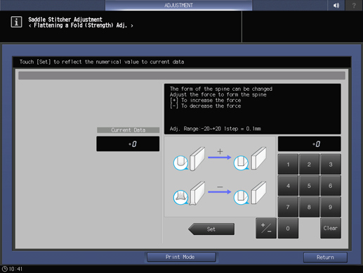 For example, if the strength is set to the Strong direction in this adjustment, the reference value of the spine corner forming strength totally shifts to the Strong direction. If the strength specified on the COPY screen or using the printer driver is insufficient, you can specify a stronger strength in this adjustment, but be careful that the reference value shifts totally.
