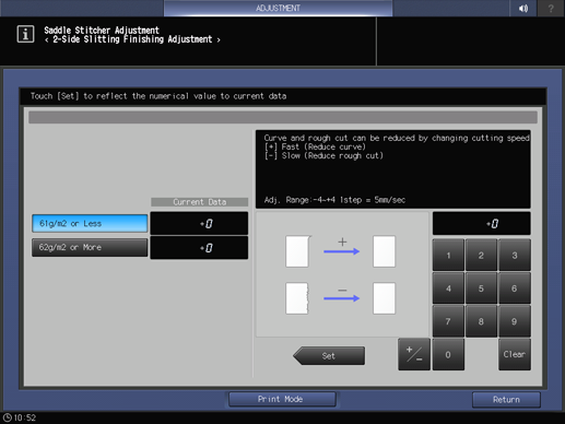 7. If any adjustment is required, press Exit PrintMode to return to the 2-Side Slitting Finishing Adjustment screen.