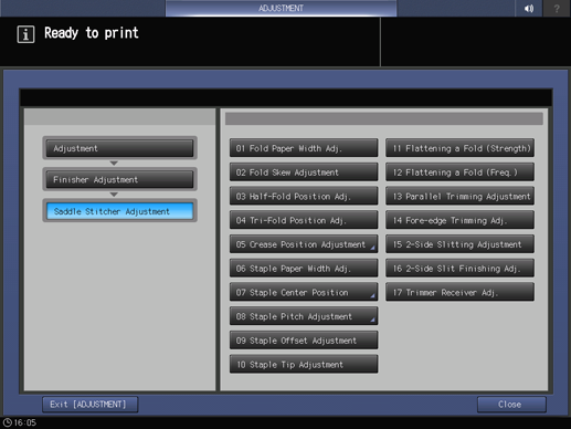 Press Finisher Adjustment, Saddle Stitcher Adjustment, and Trimmer Receiver Adj. in sequence.