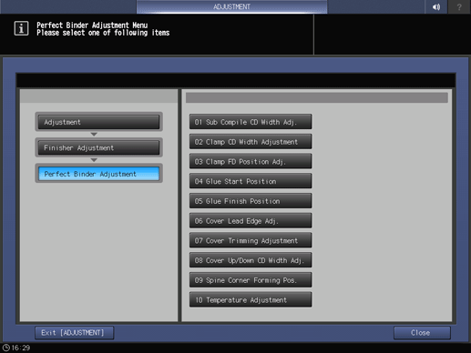2. Press Finisher Adjustment, Perfect Binder Adjustment, and Glue Start Position in sequence.
