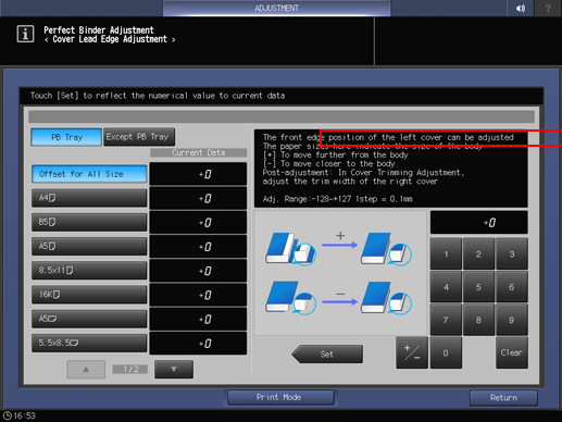 The screen returns to the Perfect Binder Adjustment Menu screen.