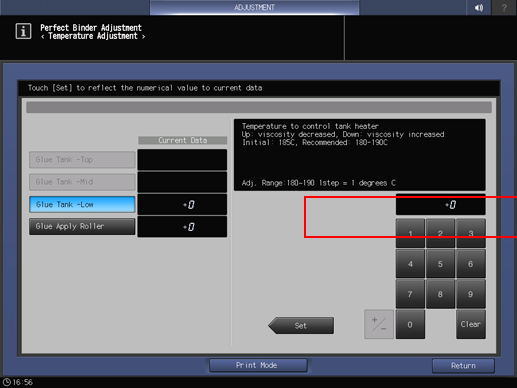 2. Press Finisher Adjustment, Perfect Binder Adjustment, and Temperature Adjustment in sequence.