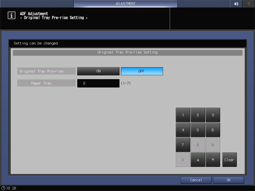 If you set Original Tray Pre-rise to ON, use the touch panel keypad or downup to enter the setting value of Paper Tray.