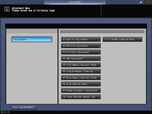 Press Adjustment on the MACHINE screen to display the Adjustment Menu screen.