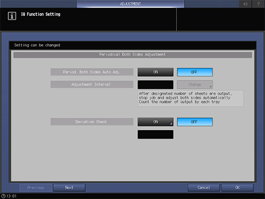 Period. Both Sides Auto Adj. | When data is printed out by the number of sheets specified in Adjustment Interval, you can select whether to periodically output charts and perform both sides adjustment. If ON is selected, you can set Periodical Adjustment to ON or OFF for each tray in the AutoMeasure tab of the Both Sides Adjust screen. |