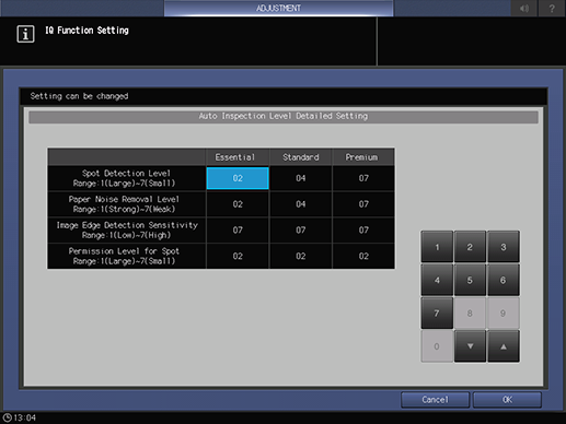 Automatic Inspection Level Setting | Adjust the detection standard for automatic inspection. There are three levels: Essential, Standard, and Premium, for each of which you can adjust the detection standard. For details, refer to Automatic Inspection Level Setting. |