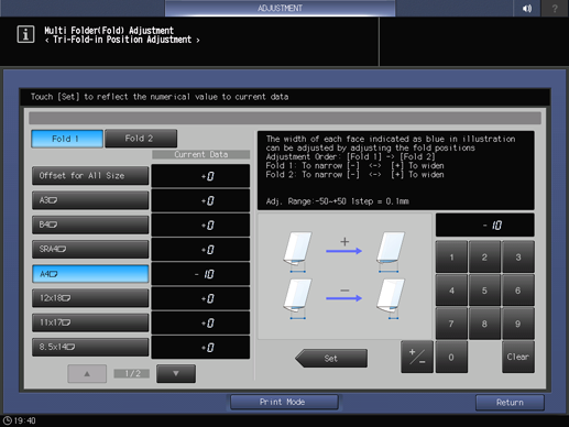 Select the paper size and press Fold 1 or Fold 2. Enter the adjustment value and press Set.