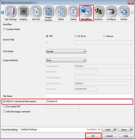 3. In the Workflow tab, select the PDF/VT-2 External Files Search check box, and enter the sub folder name. In this example, enter the sub folder name, CompanyA, of the sub folder created under the pdfvt folder. Then, click OK.