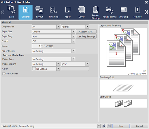 The setting items on this screen are the same as for the General screen of the Job Settings screen, excluding Range. For details about the description of the common setting items, refer to General Screen.