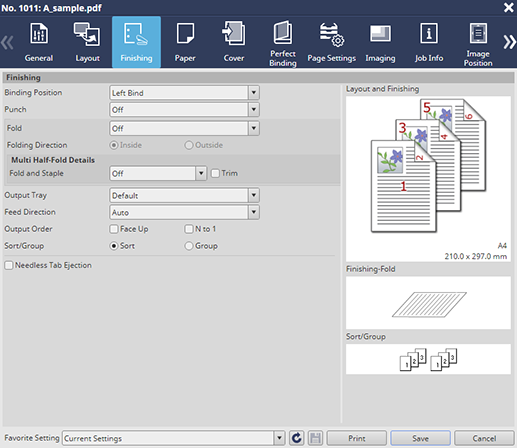 The setting items here are the same as those of the Finishing tab of the PS Plug-in driver. For details about the description of the common setting items, refer to Finishing Screen.
