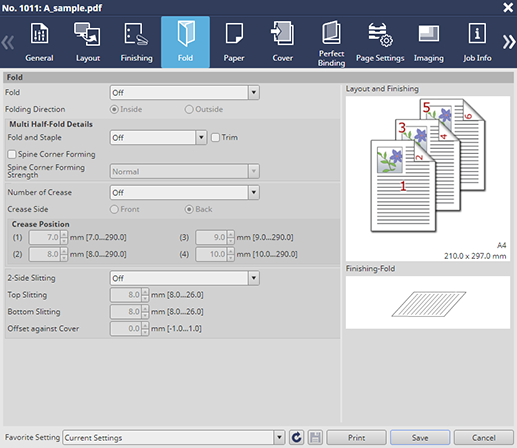 The setting items here are the same as those of the Fold tab of the PS Plug-in driver. For details about the description of the common setting items, refer to Fold Screen.