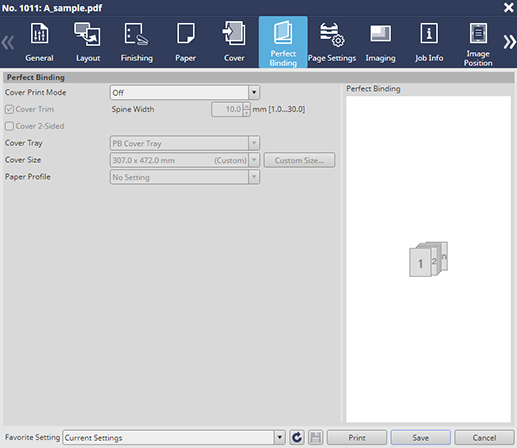 The setting items here are the same as those of the Perfect Binding screen of the PS Plug-in driver.For details about the description of the setting items, refer to Perfect Binding Screen.