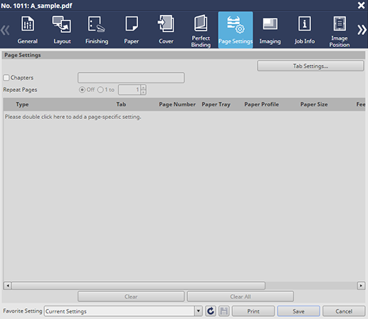 The setting items here are the same as those on the Page Settings screen of the PS Plug-in driver except the Tab Settings. For details about the description of the common setting items, refer to Page Settings Screen.