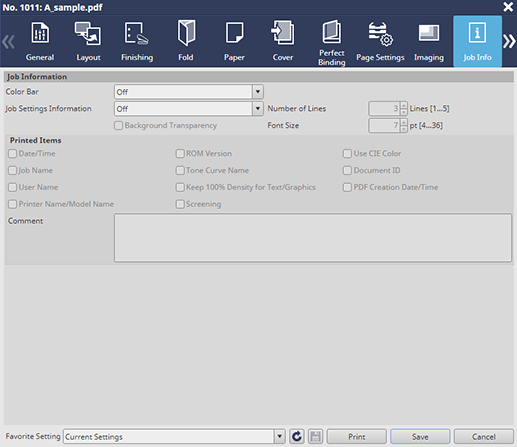 Document ID | The Document ID is displayed only when a page editing job is for PDF. To print the Document ID in a PDF file, select an option other than Off in the Job Settings Information, and select this check box. |