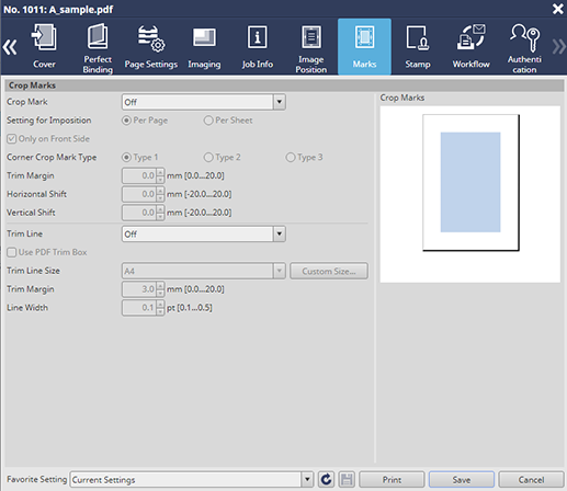 For details about the description of the setting items, refer to Marks (Crop Marks) screen.