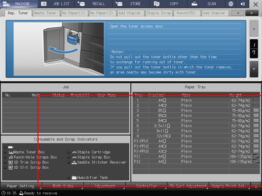 Press the Rep. Toner tab in the help message area of the MACHINE screen.